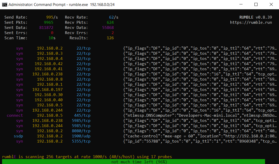 The scanner now reports the estimated time remaining, writes out a CSV file as a default artifact, and includes all the same fingerprint improvements and bug fixes as the agent. Raw IP interfaces are now supported