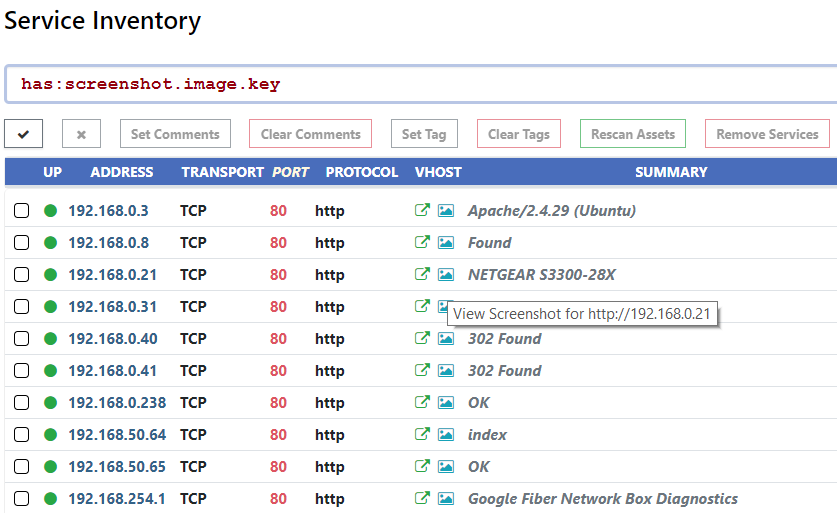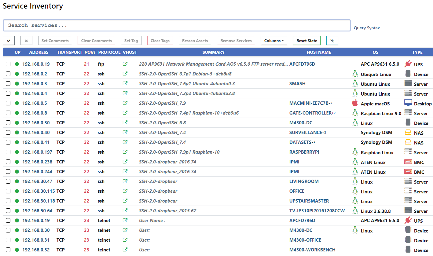 This release adds the Services tab to the Inventory. Use this interface to find configuration issues, investigate unknown devices, and explore the network from a different angle. Results can be sorted, filtered, and exported into JSON or CSV formats.