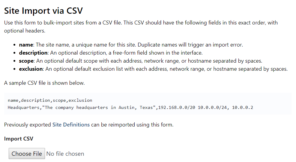 Site definitions (name, scope, exclusions, description) can now be imported and exported from the Sites page, enabling Site creation using Excel, scripts, or an existing CMDB.