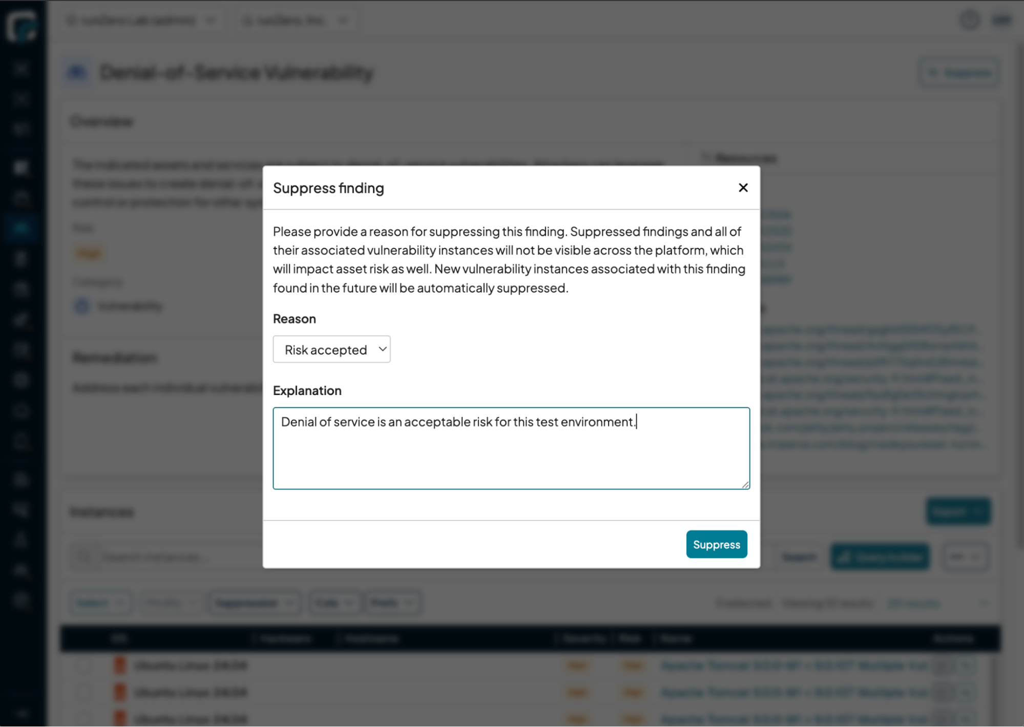In addition to Findings, suppressions can be applied to Vulnerability Groups (all instances of a specific vulnerability by name and source) and individual instances of a Vulnerability, tied to a single asset and/or service. After applying a suppression, the risk of the related assets will be adjusted to match.