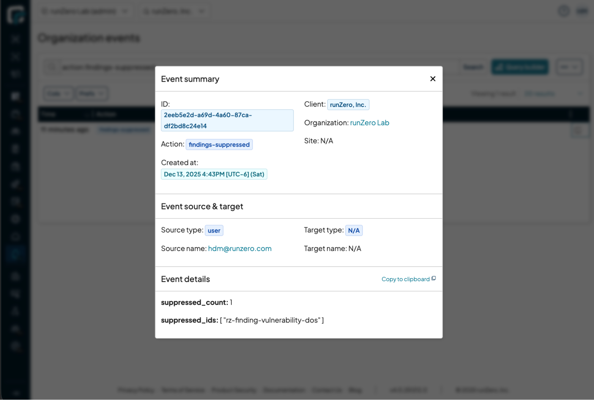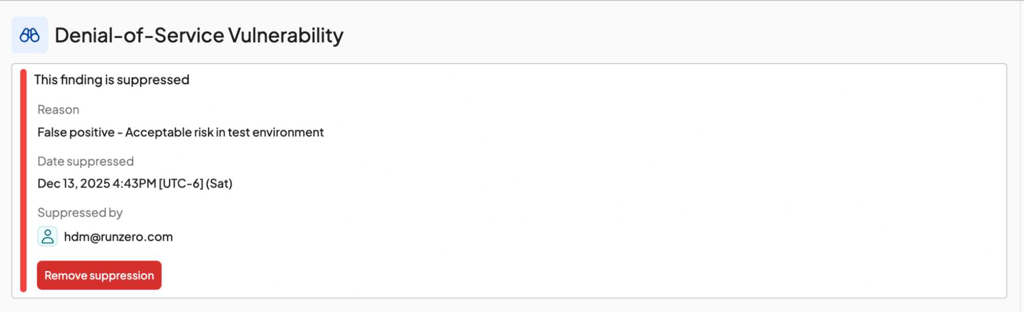 All suppression actions are recorded in the event log and can be found using the search term: action:findings-suppressed OR action:vulnerability-groups-suppressed OR action:vulnerabilities-suppressed