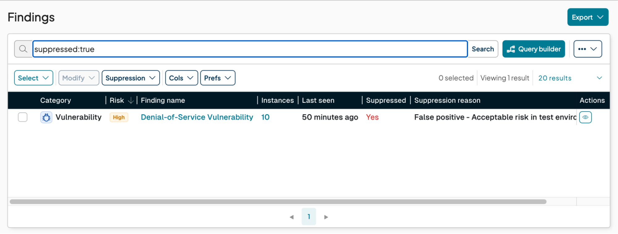 When a Finding or Vulnerability Group is suppressed, all of the individual vulnerability records identified for the Finding or Vulnerability Group are also suppressed. Additionally, any new vulnerabilities discovered for a suppressed Finding or Vulnerability Group in the future will automatically be suppressed as well.