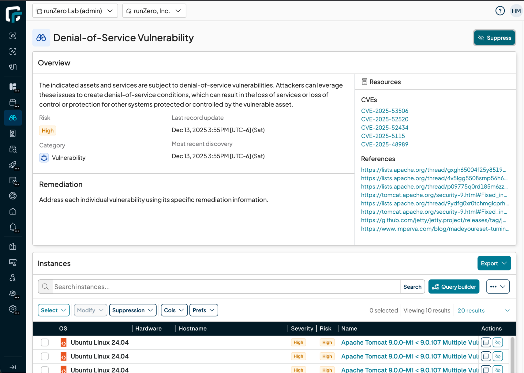 The runZero platform now supports suppressions for Findings, Vulnerability Groups, and individual Vulnerability instances. This feature can be used to ignore specific issues, filtering them from the default views, and adjusting asset risks to match. Suppressions are useful for filtering issues that are false positives, present an acceptable risk, or are generally non-actionable in your environment.